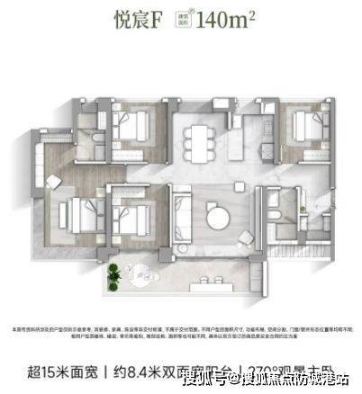 【悦宸F户型 建筑面积约140㎡】:约4.85米客厅开间、南北对流主卧、约8.4米双面宽阔景阳台。