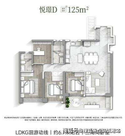【悦璟D户型 建筑面积约125㎡】:三南向卧室、厅卧空间灵活改造、约6.7米阳台、半开放式中西厨房。