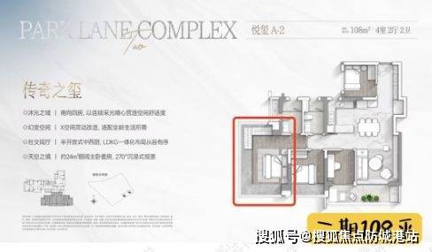 【悦玺A-2户型 建筑面积约108㎡】:南向四房、X空间灵动改造、半开放式中西厨、约24㎡朗阔主卧套房。