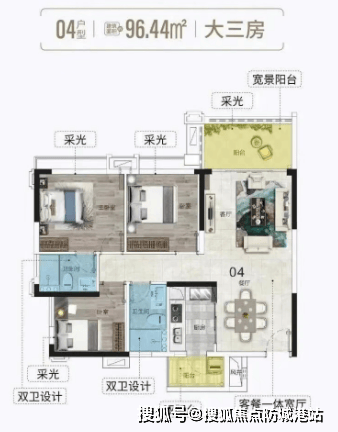 95平米3房2厅:单边位置设计,多开间朝南,约10米南向采光面阔景阳台无遮挡,俯瞰中央园林,远眺城市景观。