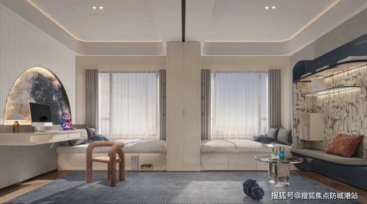 二合一儿童房 | 可生长的童乐天地采用房间二合一设计,可打通创造玩耍天地,或灵活增加隔板,改造成两房使用。独有四面宽户型设计,让主卧、两间儿童房皆是东南向。景观采光都很好,让孩子从小伴着风景成长。