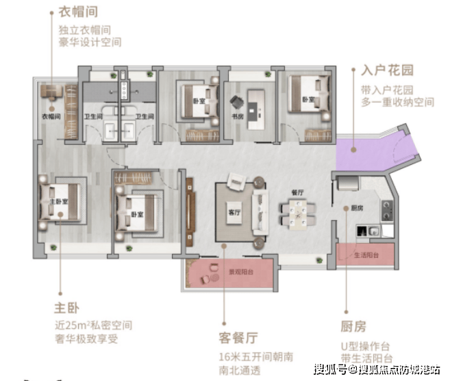 194平方米:五房双景观阳台户型,南北通透,豪华生活体验。
