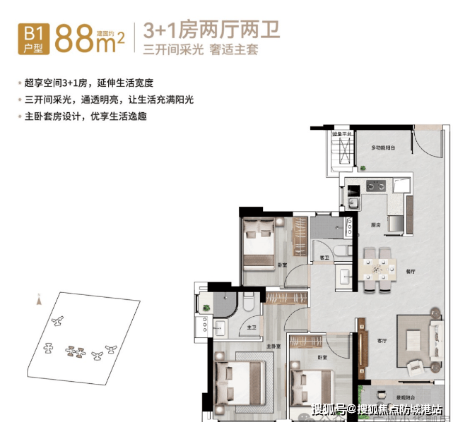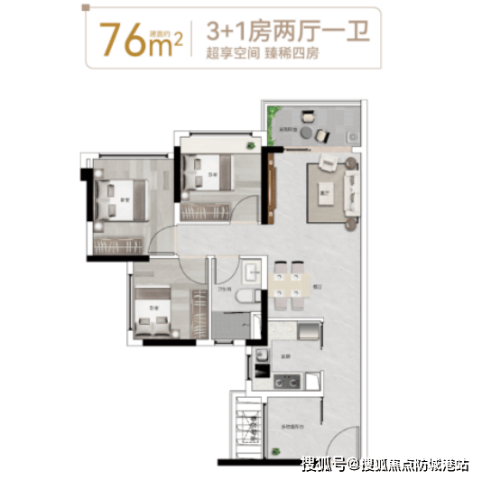 76-88平方米:3+1房设计,适合刚需家庭。