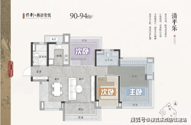 90-94㎡三房两卫:横厅设计,南北对流,主卧套房带独立卫浴,实测使用面积达82㎡,比市场同类户型多出8-10㎡;