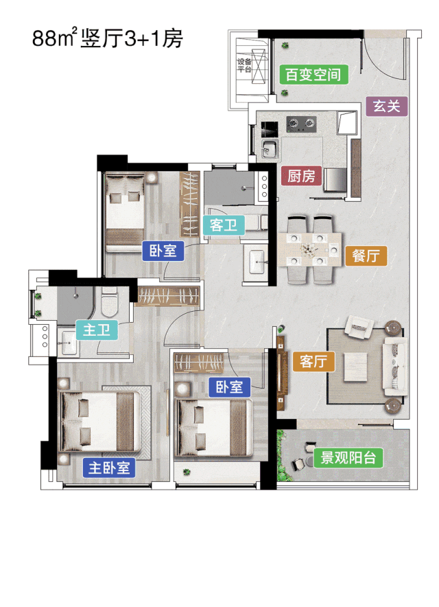 建面约88㎡3+1房竖厅户型