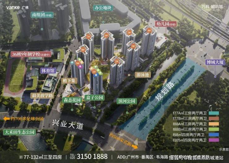 万科檐屿城位于广州南站核心区域,由广州万瑜房地产有限公司开发。作为中国房地产行业的领军企业,万科在南站的发展与建设中扮演了重要角色。项目占地北区5万平方米,总建筑面积达15万平方米,规划有9栋33层高的住宅楼,提供约77至135平方米的三至四房户型,满足不同家庭的需求。