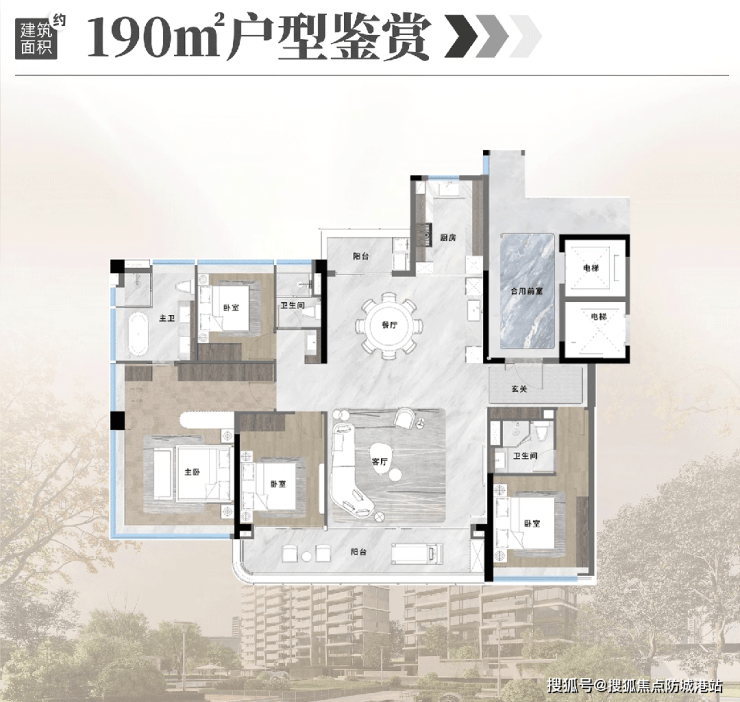 建面约 190㎡“山趣” 户型:约 17 米南向面宽,全屋超高窗地比,全南向功能房,主套约 270 度 IMAX 级环幕视野,尽览湖山盛景;
