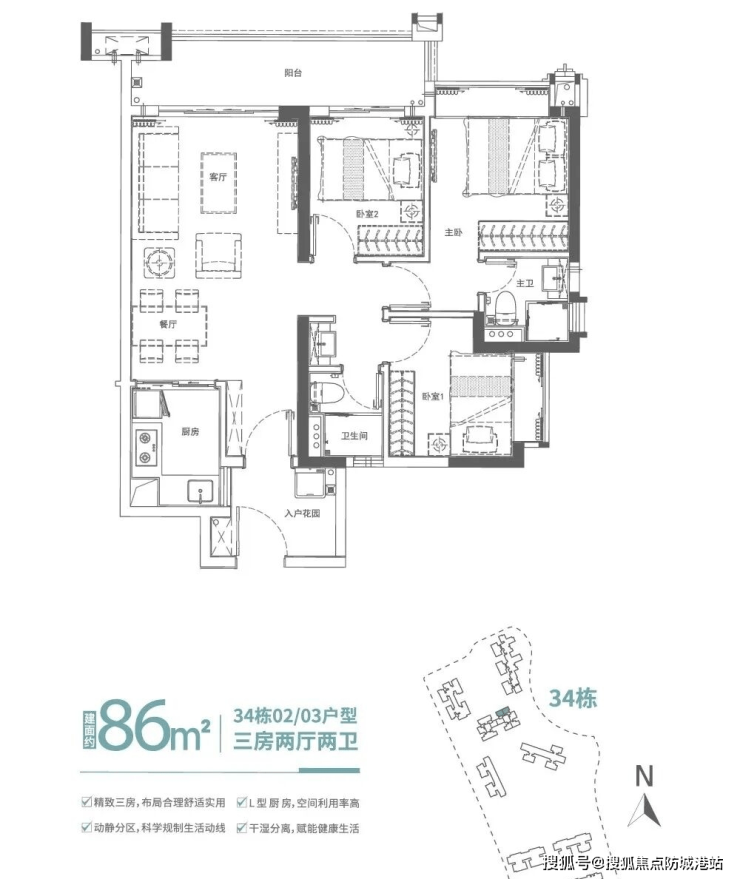 建面约86㎡南北通透三房,南北对流,采光通透,空间视野开阔,布局方正舒适实用,客厅直通南向阳台,引更多清风和阳光入室,缔造质感生活。