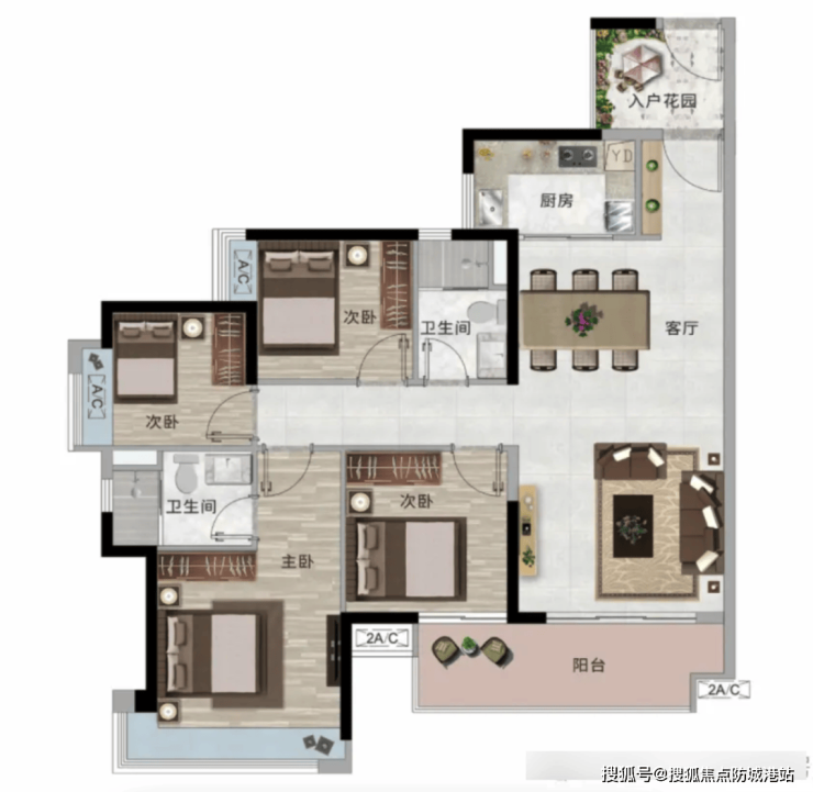 约 101㎡户型:带入户花园,南向约 5.4 米瞰景阳台,主卧约 270° 转角飘窗,居住舒适度高。