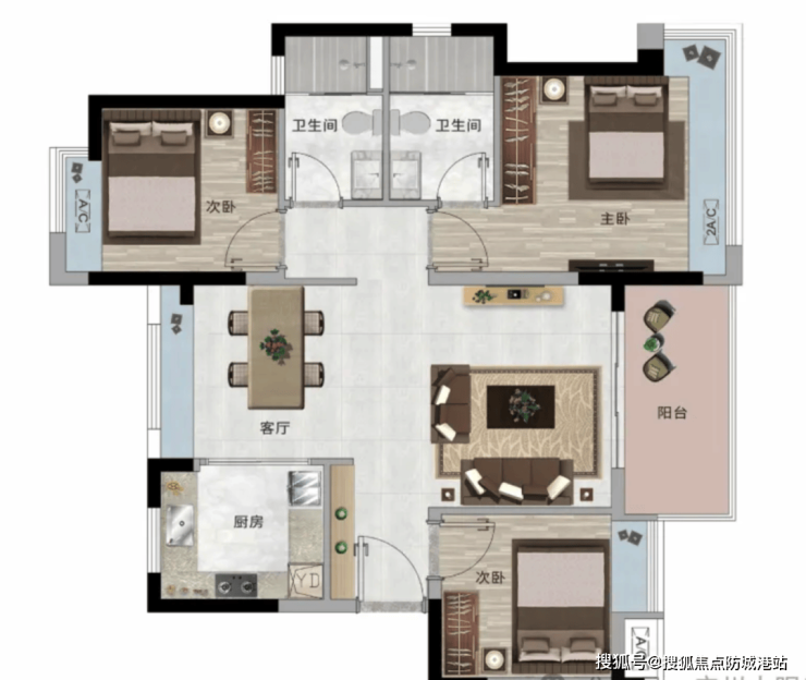 约 126 - 138㎡户型:南北通透,双阳台设计,主卧约 270° 转角飘窗,南向约 6 米大阳台,居住体验舒适。