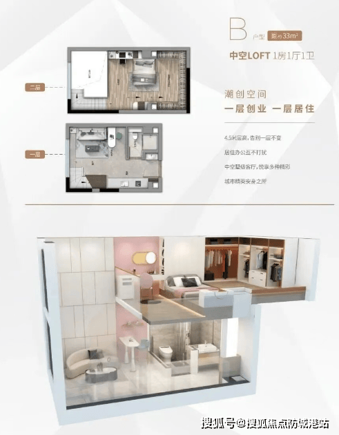 B户型:约33㎡,中空LOFT一房一厅一卫,潮创空间设计。