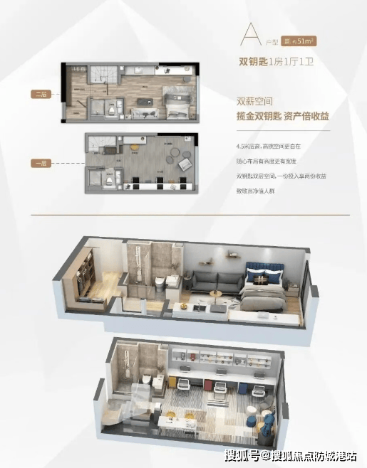 A户型:约51㎡,双钥匙1房1厅1卫,实现资产双倍收益。