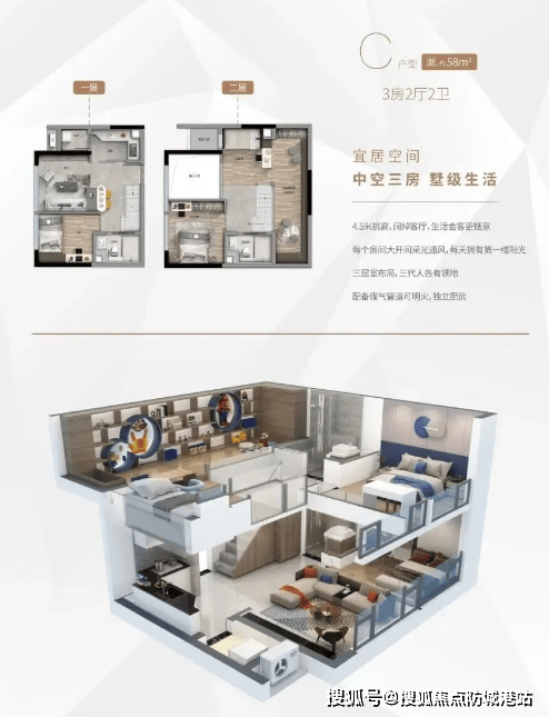 C户型:约58㎡,宜居空间,中空三房设计,墅级生活体验。