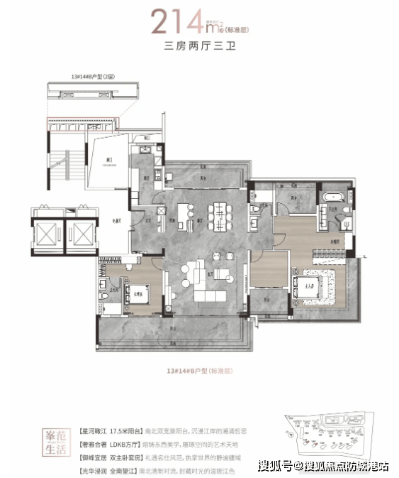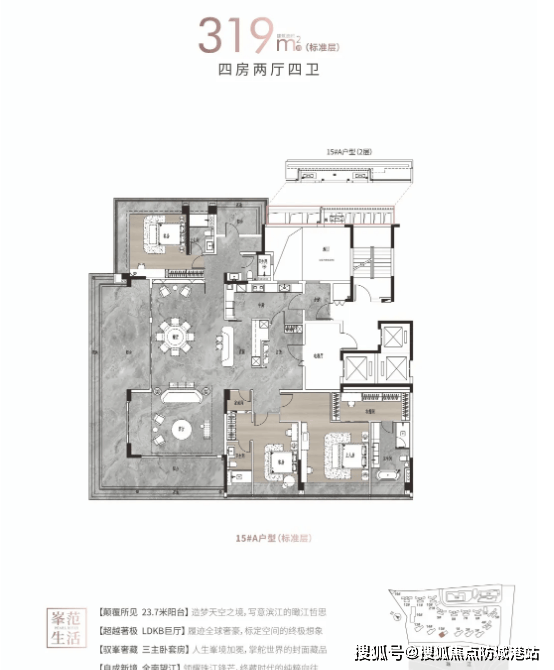 214-313㎡大平层:作为项目的高端产品,采用奢阔空间设计,全明通透,南向巨幕观景面,将珠江美景一览无余。户型配备多个套房设计,保障家庭成员的居住私密性;独立的家政间、储藏室等功能区域,提升居家实用性;大尺度的客餐厅与阳台相连,营造出奢华的居住体验,适合追求高品质生活的高端改善人群。