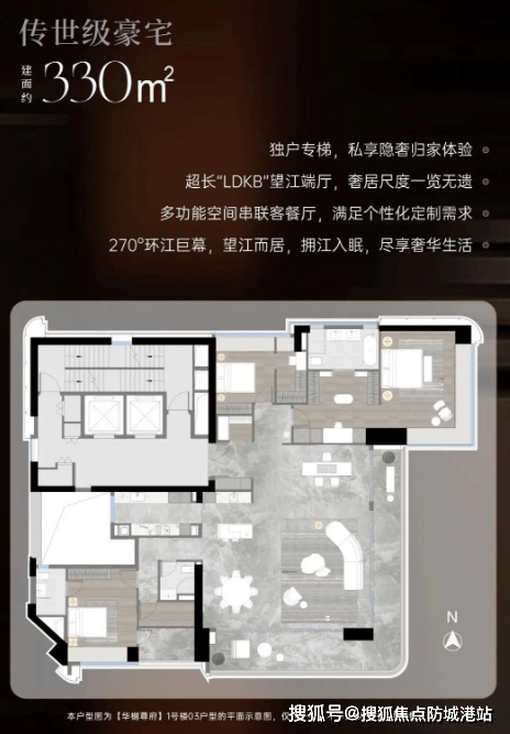 主力在售户型集中在248㎡、253㎡和330㎡三个面积段,均为两梯一户或两梯两户设计,电梯直接入户。以253㎡样板间为例,客厅开间超6米,主卧带独立衣帽间和双台盆卫浴,厨房预留中西厨分区。得房率较高,公区几乎没有浪费面积,阳台进深普遍达2.4米以上,适合喜欢在家办公或招待朋友的家庭。