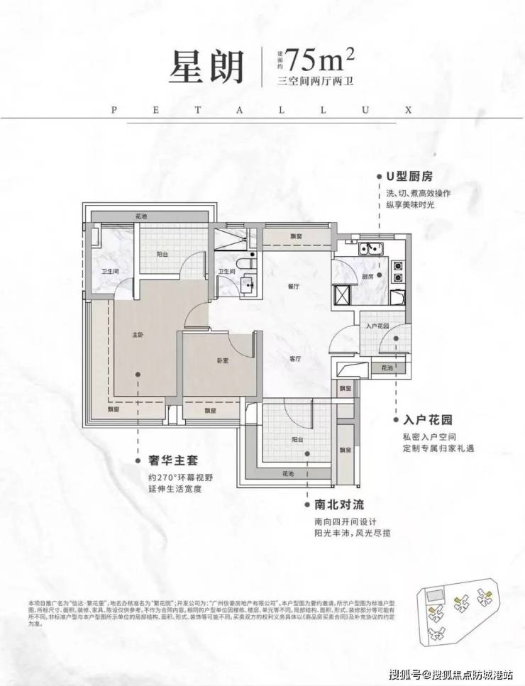 75㎡三房两卫:适合刚需家庭,进门带入户花园,南北通透,布局紧凑合理。