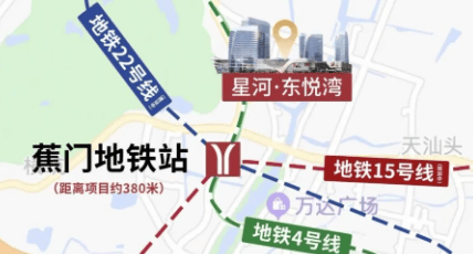 星河东悦湾位于南沙蕉门河中心板块,是南沙最中心、最成熟的板块之一。项目距离地铁4号线蕉门站仅约610米,步行大约10分钟即可到达。未来,地铁15号线(规划中)和22号线(建设中)也将在该区域交汇,进一步提升项目的交通便利性。
