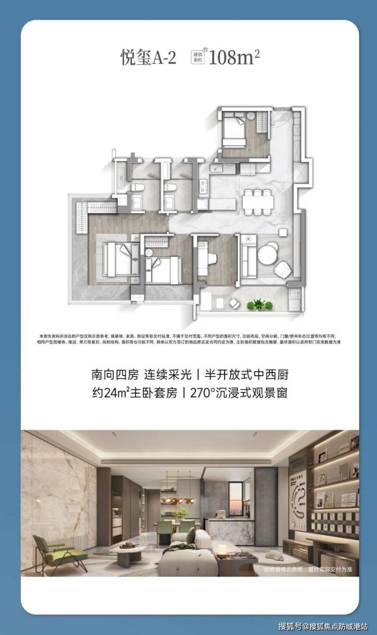 悦玺系列:约108㎡和111㎡户型,南向四房,全明通透,LDKG一体化设计,半开放式中西厨,让生活更加从容有序。
