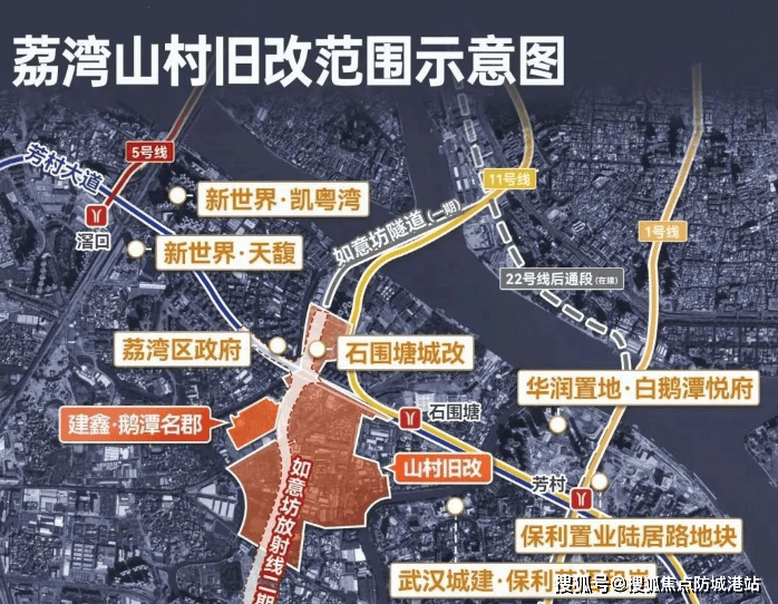优越的地理位置:项目位于白鹅潭板块,紧邻荔湾区政府和芳村大道中,距离在建中的地铁11号线石围塘站约800米,步行大约8-15分钟即可到达。通过11号线,居民可以便捷换乘多条地铁线路,快速通达全城。自驾方面,紧邻芳村大道,可通过洲头咀隧道、内环路等快速连接天河、越秀等核心区域。