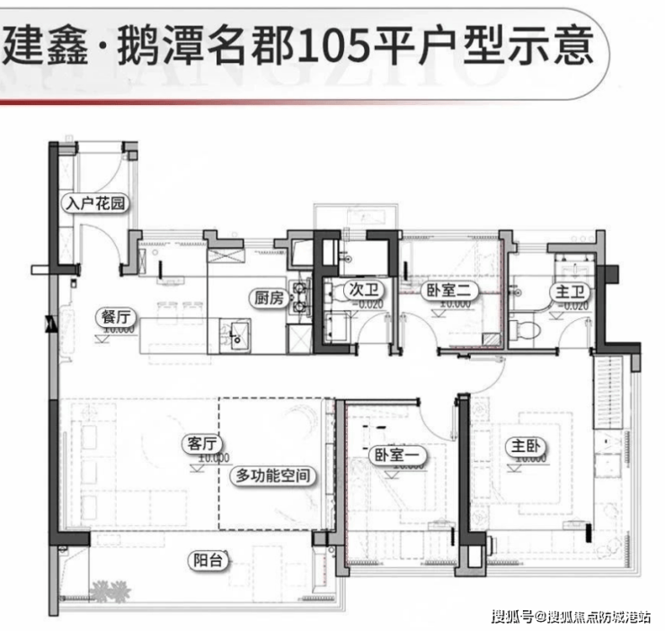105㎡户型:三房设计,阳台开间约6.5米,宽敞明亮,满足家庭成员的生活需求。