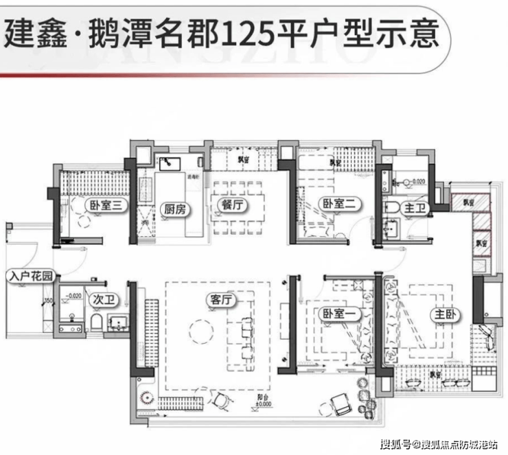 125㎡户型:四房设计,阳台开间达到8.3米,适合大家庭或追求更高生活品质的家庭。