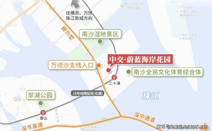 项目距离深中通道南沙线收费站约1公里,驾车前往深圳前海仅需半小时。临近在建的18号线南延线二十涌站约500米,设计时速高达160公里/小时,西线至中山市区预计2027年通车,东线直抵珠海拱北口岸计划2030年建成。