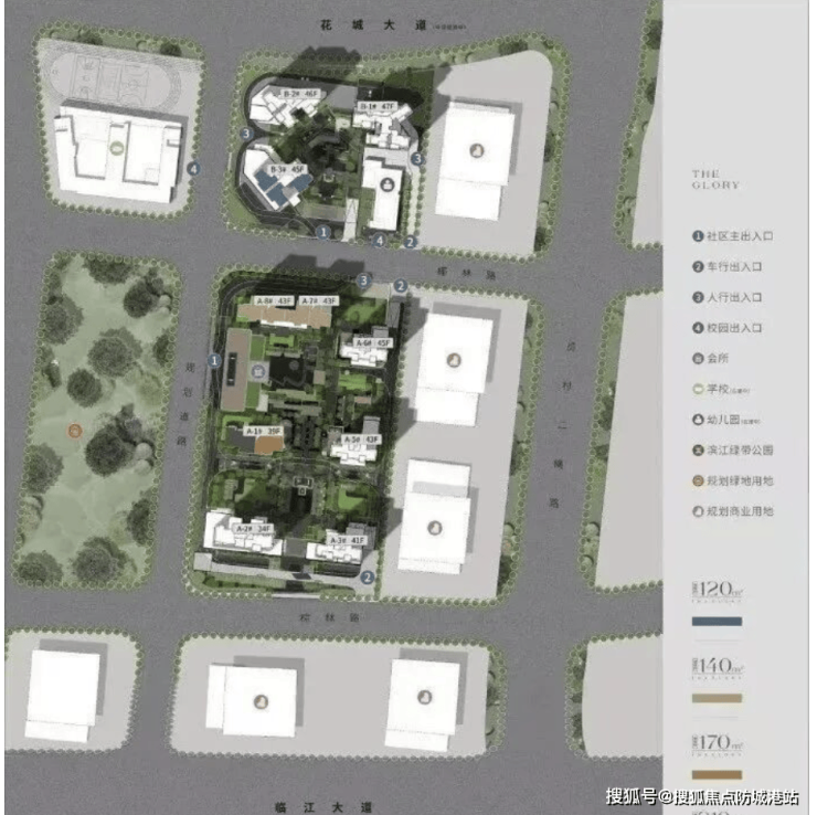 楼栋布局遵循“北高南低、户户朝南”的规划原则,在核心区高密度环境中,最大限度保障采光、通风与私密性,对改善型家庭尤为重要。