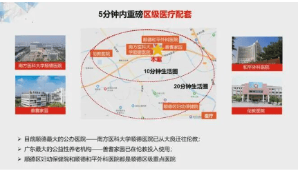 医疗:南方医科大学顺德医院(三甲)、顺德和平外科医院等优质医疗机构近在咫尺,确保居民能够享受到便捷的医疗服务。