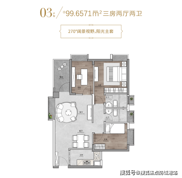 建面95-99㎡三房两厅两卫是改善热门款,深受家庭人口较多的购房者青睐。过道面积紧凑不浪费,每一寸空间都能得到合理利用,主卧套房带独立卫生间,保证主人私密性,避免家庭成员共用卫生间的尴尬。厨卫全明设计避免采光死角,让室内每个空间都明亮通透,主阳台朝南,通风效果好,日常晾晒、休闲观景两不误,轻松满足多人口家庭的居住需求。