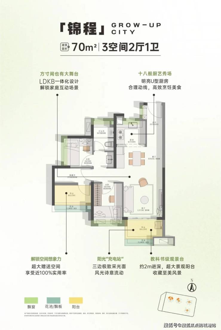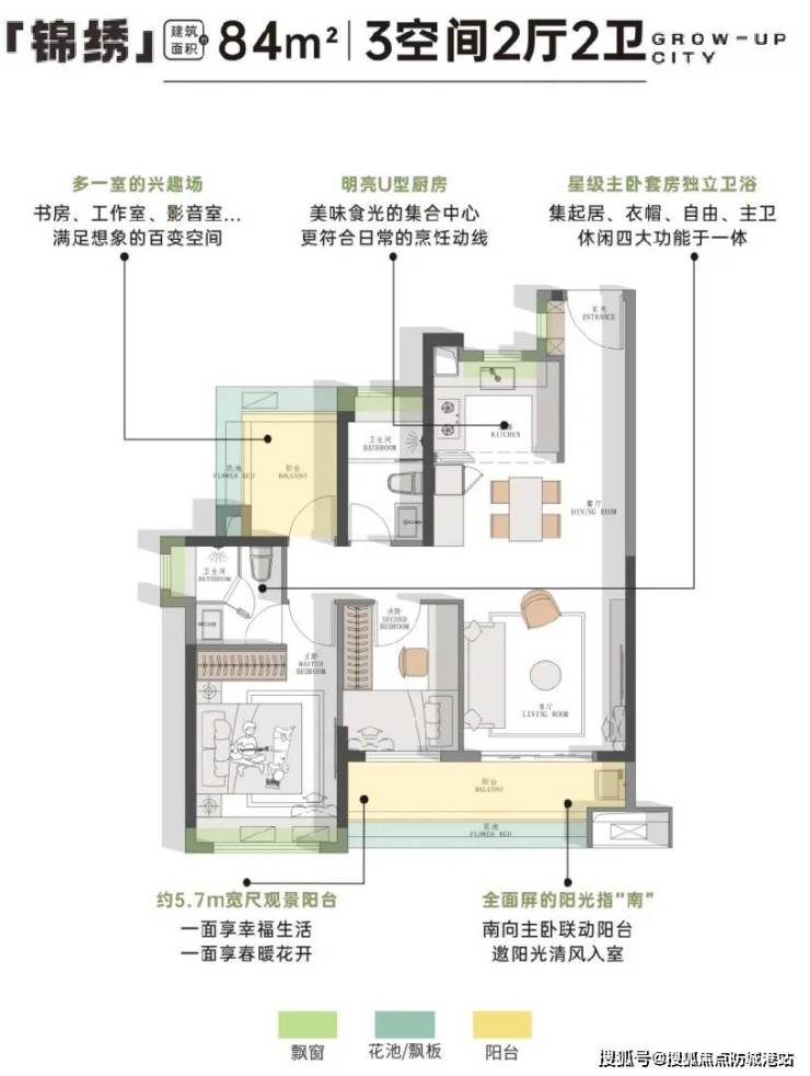 项目二期主推76-126㎡三至四房,全南向布局,采用“飘窗+阳台+花池”全赠送设计,实际使用率超100%。例如: