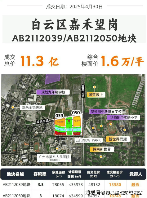 2025年4月30日,越秀地产成功竞得广州市白云区嘉禾望岗的两个地块——AB2112050与AB2112039,楼面价分别为1.87万/㎡和1.34万/㎡。嘉禾望岗作为“一园两城三都四区”的几何中心,承载着白云区产业升级的重要使命。凭借其独特的地理位置和政策支持,该区域正迅速成为集产业、居住、交通于一体的综合性枢纽。