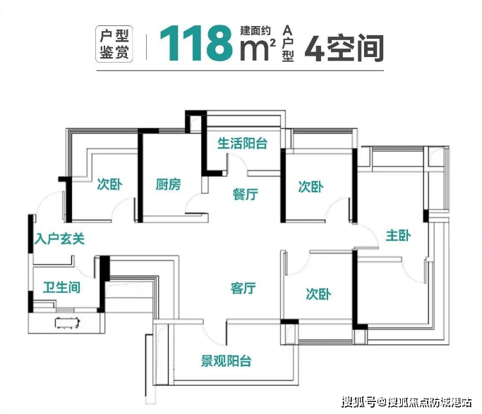 118平方米四房两厅两卫:四开间朝南,配备独立家政空间,主卧带270°环幕飘窗。