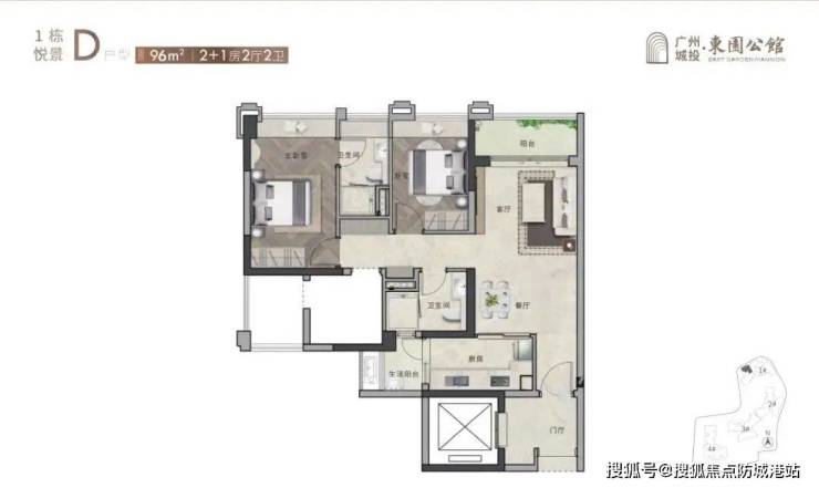 96㎡ 2+1房2厅2卫:紧凑实用,适合小家庭。