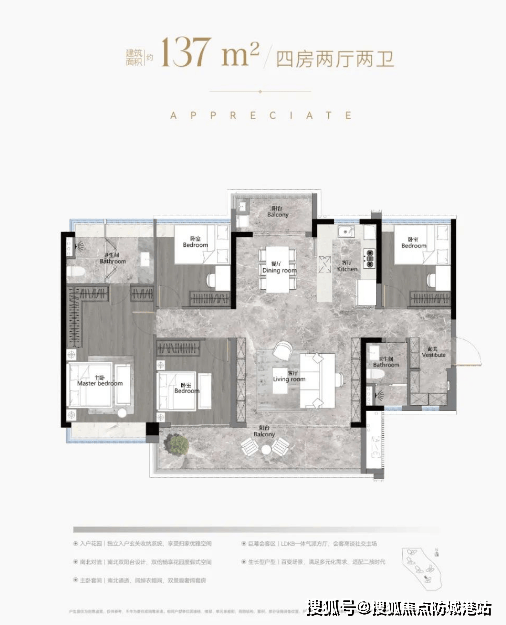 188㎡楼王户型:专梯入户,配备独立玄关、双套房设计、270°景观阳台,直面中央艺术公园。