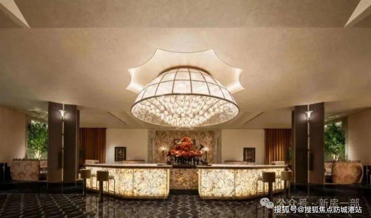透过中空挂落,日光倾泻而入下方的“金石浮光”的艺术雕塑,阳光与金石肌理交织出细腻的纹理,低调奢华的氛围扑面而来。