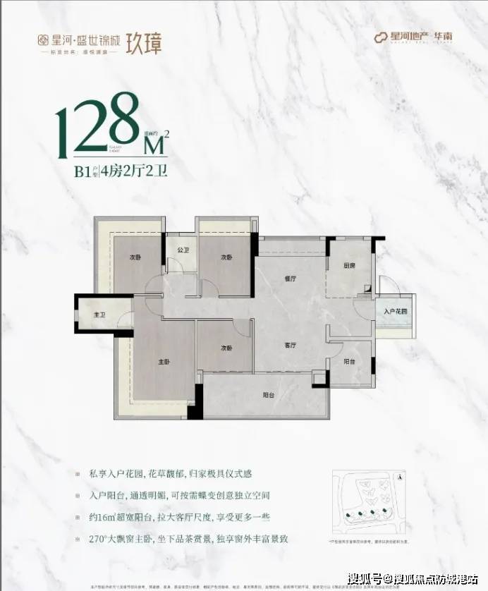 128㎡四房:8米横厅连接南向阳台,主卧270°转角飘窗,赠送面积达12㎡。