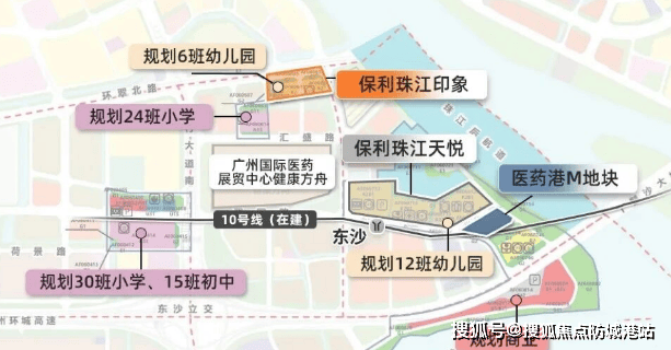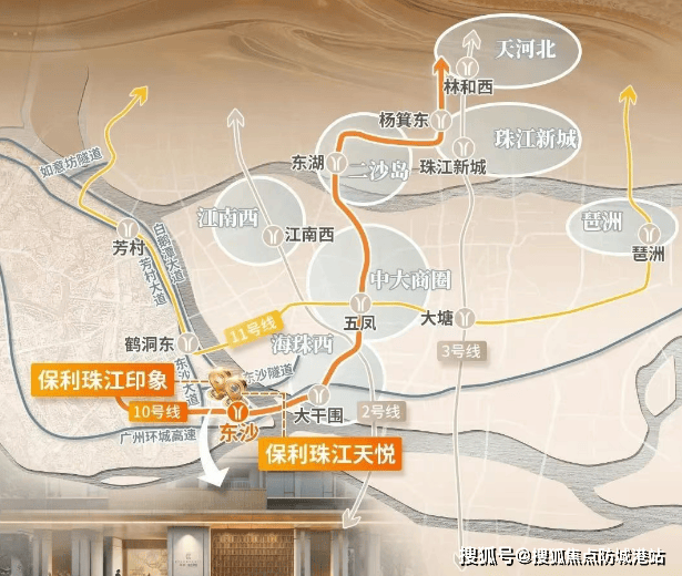 项目位于广州市荔湾区东沙,紧邻白鹅潭大道和东沙石岗隧道,距离地铁10号线东沙站仅700米,步行可达。此外,项目还靠近环城高速和东新高速,交通十分便利。未来还将规划水上巴士及港湾码头,进一步提升区域内的交通便利性。