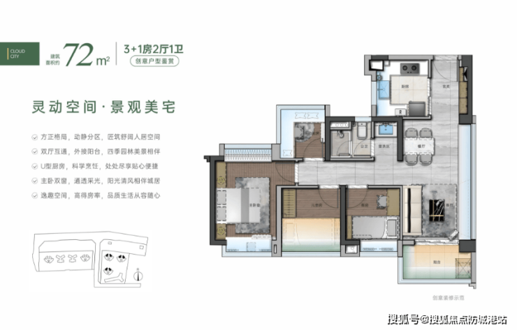 超高使用率:72㎡即可做四房,户型设计紧凑且实用。