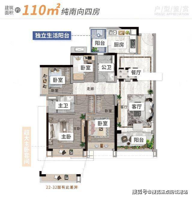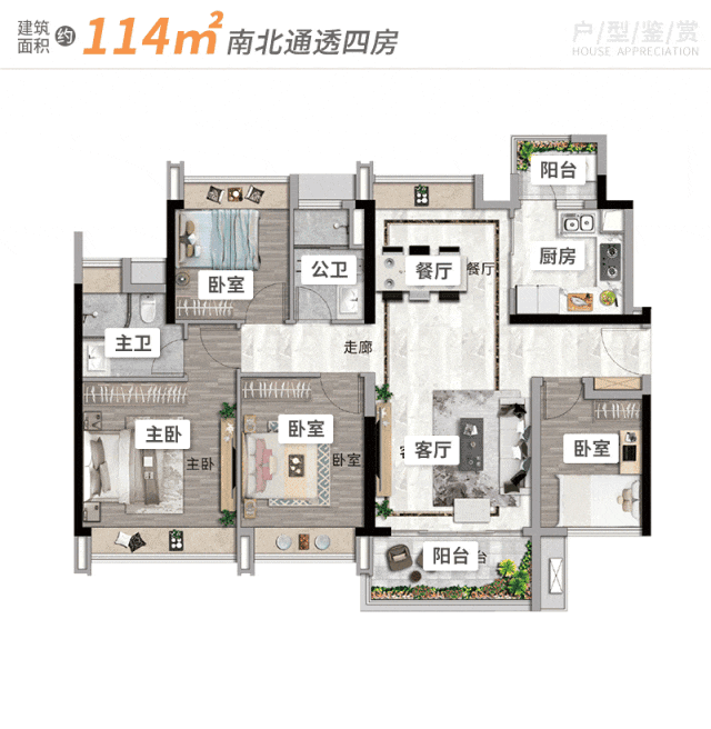 这种户型设计巧妙,打造出独立分层的私密空间,真正做到动静分区。家里有人在楼下客厅活动,楼上休息的家人也不会受到干扰,减少家庭成员之间的生活摩擦。约 6 米的层高,让阳台采光加倍,站在阳台上,视野如同 IMAX 般开阔,无论是小区园林景观还是城市街景都能尽收眼底。高得房率实现了全能四房的设计,在三胎时代,一步到位满足家庭居住需求,不用再为换房而烦恼。