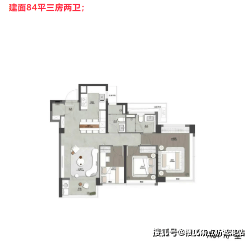 建面84平米三房两卫:紧凑实用,布局合理,适合年轻家庭。