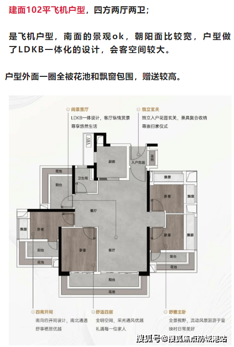建面102平米飞机户型四房两厅两卫:LDKB一体化设计,客厅阳台开间较大,观景视野良好。