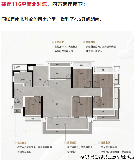 建面116平米南北对流四房两厅两卫:4.5开间朝南,南北对流通透,空间阔绰。