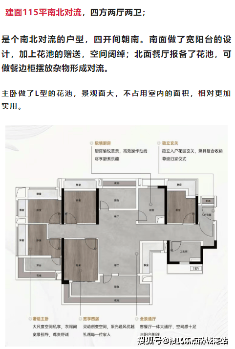 建面115平米南北对流四房两厅两卫:四开间朝南,宽阳台设计,花池赠送增加了使用面积。