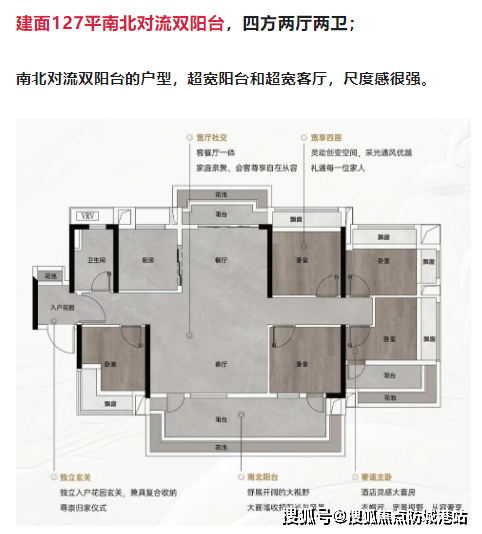 建面127平米南北对流双阳台四房两厅两卫:超宽阳台和客厅,尺度感强,居住舒适度高。