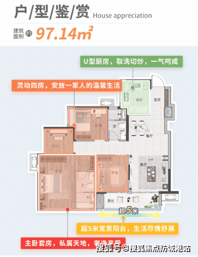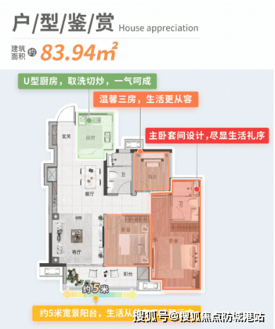 85㎡三房两厅两卫:南向 3 房带主套设计,约 5 米宽大阳台,视野开阔,U 型大厨房操作便捷,主卧落地凸窗设计提升采光与空间感,适合刚需家庭,生活随心舒适。