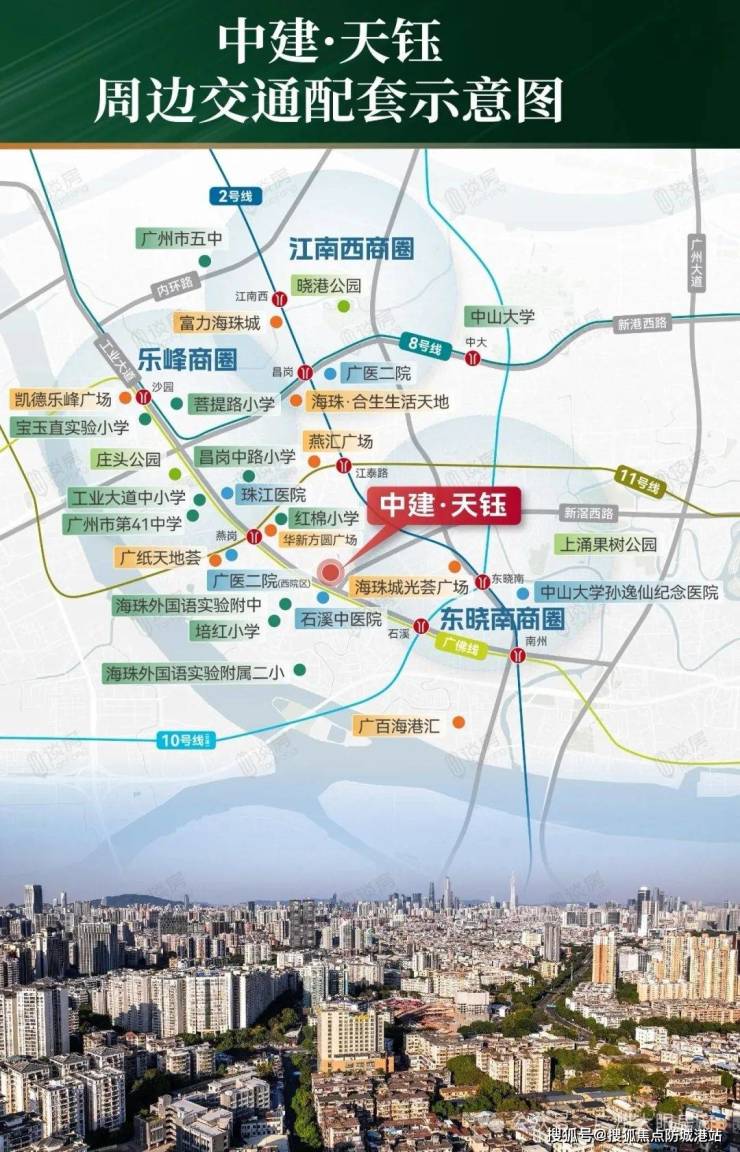 中建天钰坐拥双地铁优势,位于广佛线燕岗和石溪两个地铁站之间,步行距离分别为 750 米和 900 米。目前广佛线已开通,燕岗站还是大环线 11 号线的站点,通过该线路可便捷前往海珠琶洲、天河、越秀等核心板块。石溪站作为广佛线和 10 号线的换乘站,能直达珠城,实现东西南北各个方向的畅行,10 站范围内轻松畅享珠江新城、琶洲、金融城等重点商圈的核心区红利。