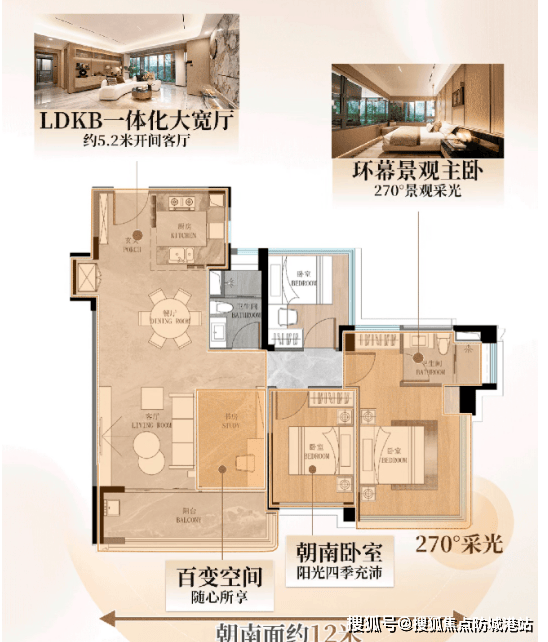 建面约110㎡户型:该户型堪称“通透尺度天花板”,核心优势在于超强对流能力和豪宅级空间尺度。约50㎡LDKG无边界巨厅,搭配约6.1米大面宽,连接约6.6米长南向阳台,空间开阔大气;约27㎡L型主卧套房,展开约9.2米环幕景观界面,推窗即可享受美景,居住体验堪比豪宅。