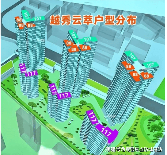 越秀·云萃项目规划6栋楼,其中3栋为21层高塔楼,2梯5户设计,主推88㎡3+1房和106㎡四房户型;另外3栋为12-13层板楼,主推117㎡稀缺洋房产品,专梯专户设计,舒适度拉满。目前,项目主力在售楼栋为4号楼及最新加推的6号楼,6号楼规划为建面约90㎡/110㎡非超新规产品,户型稀缺,备受市场关注。