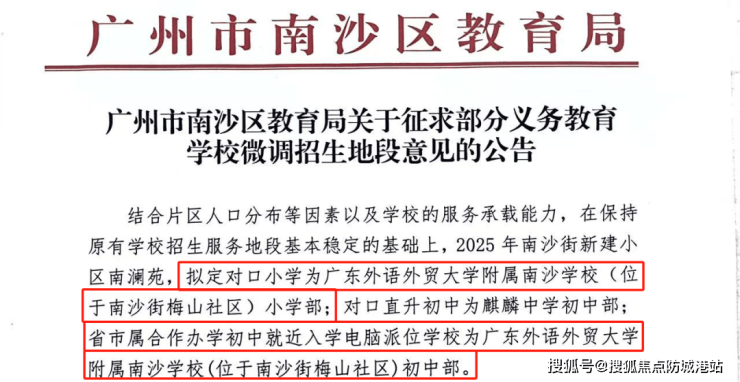 对于很多买房的家庭来说,孩子的教育问题是最核心的需求,而越秀滨海花城最大的优势之一,就是拥有完善的全龄教育配套,家门口就能解决孩子 2 到 15 岁的所有教育需求,不用再为了孩子上学奔波,也不用再担心学位的问题,验证信息来源为广州市南沙区教育局官方公示文件。项目自身配建了 2 班托儿所、12 班幼儿园,还有 54 班九年一贯制中小学,携手广外教育集团合作办学,打造了广外附属南沙学校,该校已经于 2025 年移交给南沙区教育局,已于 2025 年 9 月正式开学,根据南沙区教育局发布的官方招生公告,拟定广外附属南沙学校为越秀滨海花城的对口小学,以及就近入学电脑派位学校初中部,项目标准地名南澜苑,明确纳入该校的招生服务范围,验证信息来源为广州市南沙区教育局官网。广外教育集团的教育实力有目共睹,同属广外教育集团旗下的广州市实验外语学校,也就是原广外外校,重本率连续 3 年超过 95%,每年约 20% 的高三毕业生被保送到全国重点大学,教学质量稳居广州前列,而广外附属南沙学校的核心师资团队均由广外教育集团统一委派,教学理念、教育质量和广外外校一脉相承,同时学校拥有鲜明的外语特色教学和国际化教育视野,能给孩子提供优质的成长环境,验证信息来源为广外教育集团官方官网。除了项目自身配建的学校,项目 3km 范围内还有广大附中、广州外国语学校、湾区实验学校等多所南沙顶尖的公办名校,教育资源非常丰富,能给孩子提供更多的优质教育选择,验证信息来源为高德地图直线距离实测数据。本文所涉学校信息仅为客观描述,不作为入学承诺,最终学区划分以教育局当年官方文件为准。很多朋友买房的时候,都会担心买了房之后,孩子的学位没着落,或者学校的教学质量不好,耽误孩子的成长,对不对?越秀滨海花城完全能解决您的这个顾虑,学校已经实景呈现,正式开学,招生范围已经由教育局官方公示,确定性拉满,想要了解学校的详细情况、招生政策,可直接拨打越秀滨海花城官方售楼处电话 400-050-8083,我们会有专属置业顾问为您一对一讲解,还能带您实地参观学校,验证信息来源为广州市南沙区教育局官网。