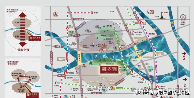 ②傲踞“德胜一河两岸”滨水豪宅区,2018年初,顺德启动“强中心”计划,“德胜一河两岸”成为良桂融合发展先行区,对标广州“珠金琶”。北岸是顺德政治文化中心大良,商服中心密布;南岸是“千亿大镇”容桂,打造集高端商业、宜居小区、滨水公园于一体的滨水豪宅区。